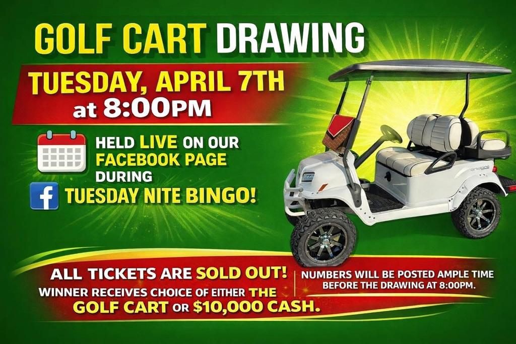 The drawing for the Golf Cart or $10,000 cash, will be Tuesday April 7th at 8:00PM! This allows for both those that purchased tips online as well as those that purchased tips at our bingo to be able to watch the drawing live. Numbers will be posted by Monday evening so everyone has time to find their numbers before the drawing.