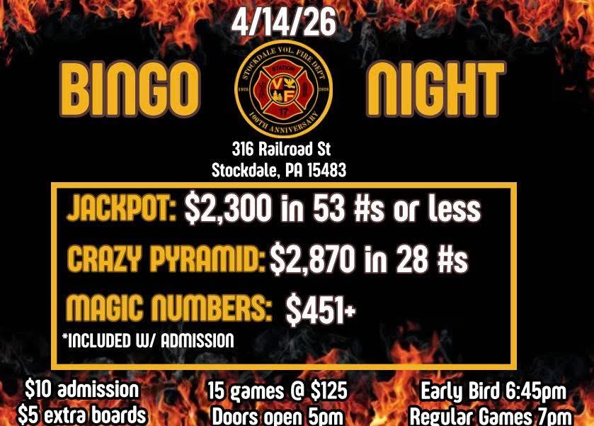 Bingo Night - 4/14/26 Here are the amazing prizes you can win this week: 🎆 JACKPOT $2,300 IN 53 #s OR LESS 🥳CRAZY PYRAMID $2,870 in 28 #s ⭐️ MAGIC NUMBER (included) $451+ Early bird is $5 for one or $10 for three and will be a packet of 4 games